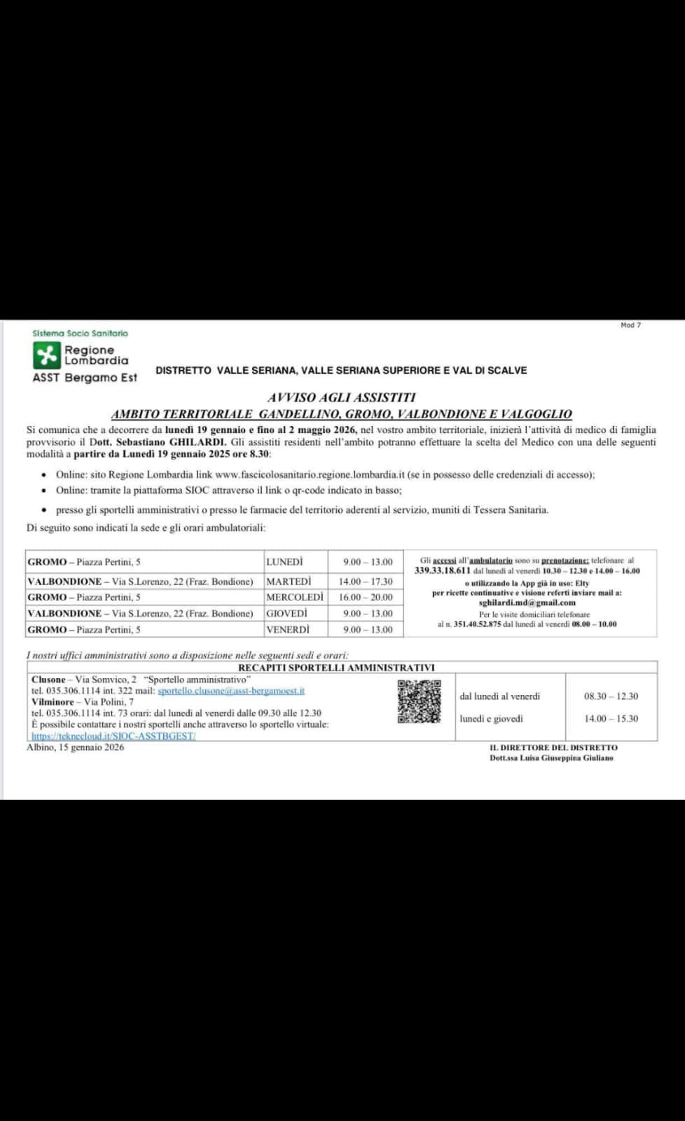 Si comunica che a decorrere da lunedì 19 gennaio e fino al 2 maggio 2026 nell'ambito territoriale Gandellino, Gromo, Valbondione e Valgoglio inizierà l'attività di medico di famiglia provvisorio il dr. Sebastiano GHILARDI.