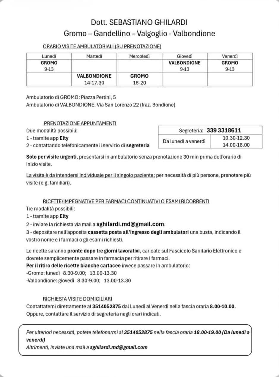 si allega informativa contenenti i giorni e orari delle visite, i numeri di telefono per gli appuntamenti, le modalità per fissare gli appuntamenti, per chiedere visite domiciliari e per le ricette/impegnative per farmaci continuativi.